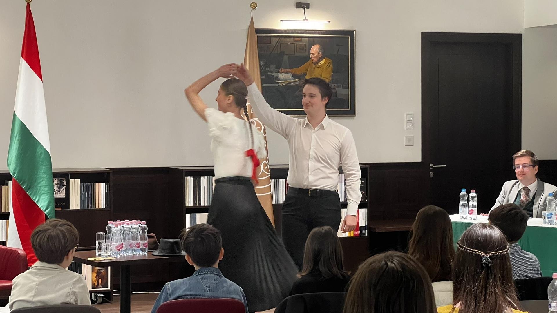 A mesék között egyetemünk két tehetséges néptáncosa, Czitrovszky Csenge óvodapedagógus hallgató és párja, Tóth Levente Daniel nemzetközi igazgatás szakos hallgató szórakoztatta a közönséget mezőségi és kalotaszegi páros táncokkal.